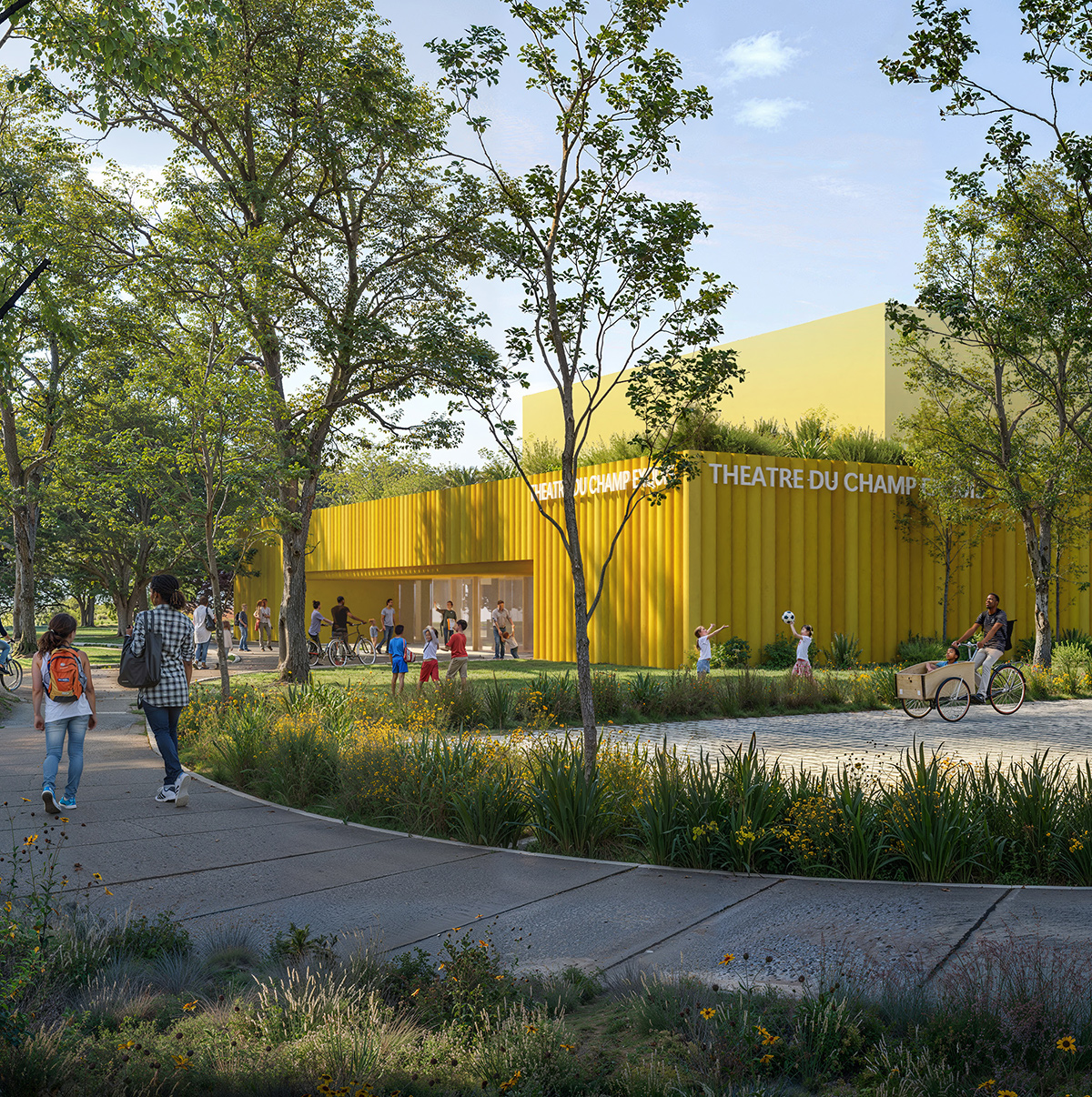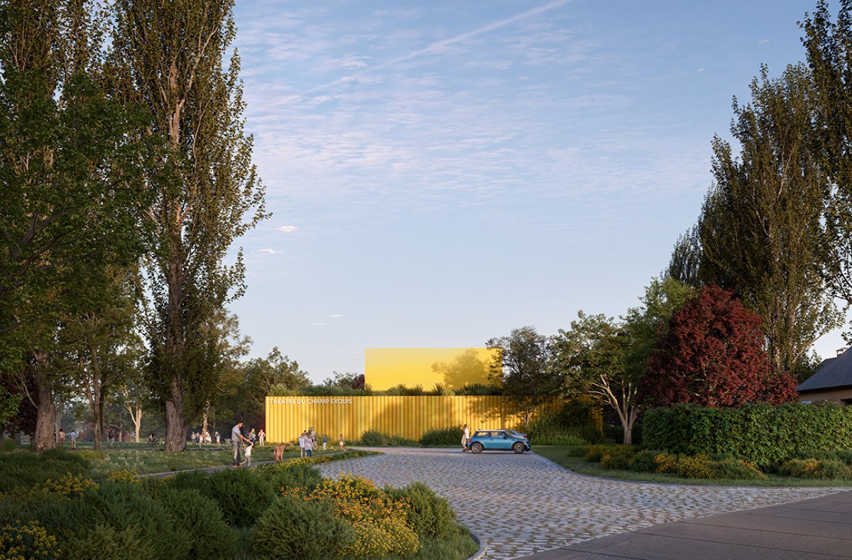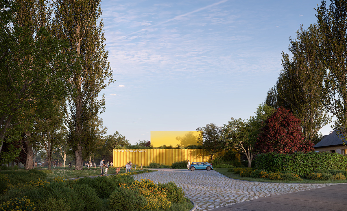 Le projet retenu pour le Théâtre du Champ Exquis se caractérise par une architecture compacte de forme carrée, structurée autour d’un volume central surélevé. La façade jaune ocre, animée d’un effet drapé, affirme une identité forte. La notion de « parcours » guide l’intégration du bâtiment dans son environnement, avec une orientation privilégiée vers les façades est et sud-est.